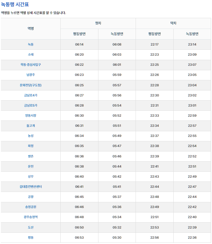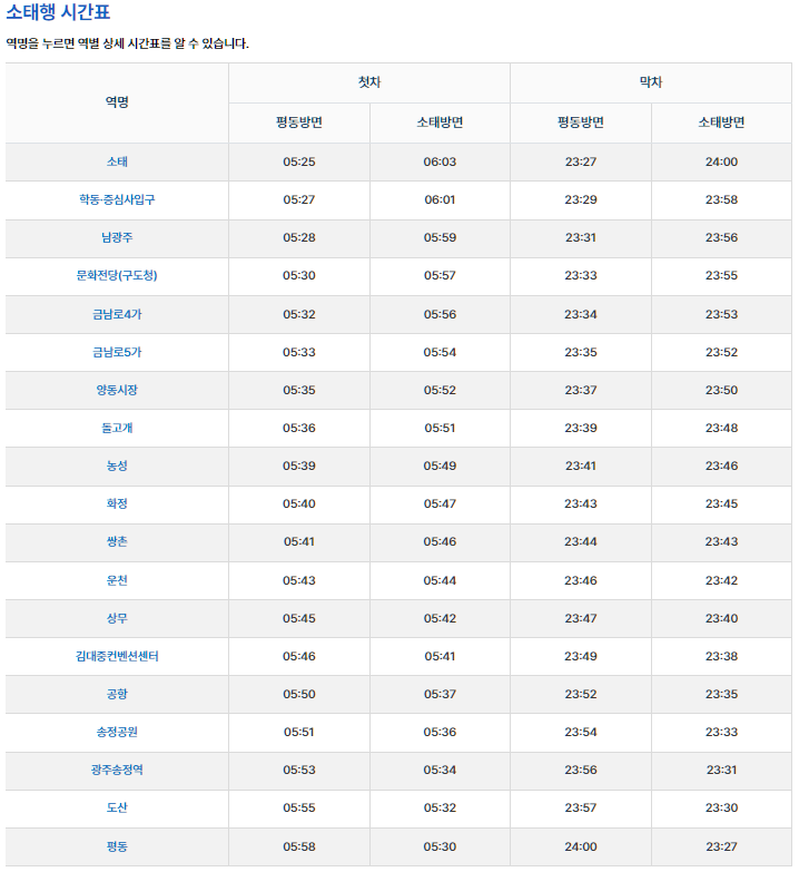 참고: 첫차와 막차 시간은 운영 상황에 따라 변경될 수 있으므로, 최신 정보를 광주도시철도공사 공식 웹사이트나 모바일 앱을 통해 확인하는 것이 좋습니다.